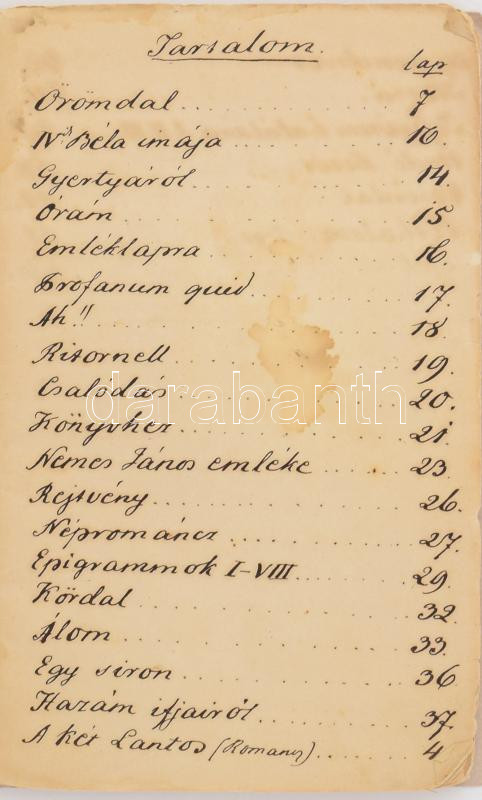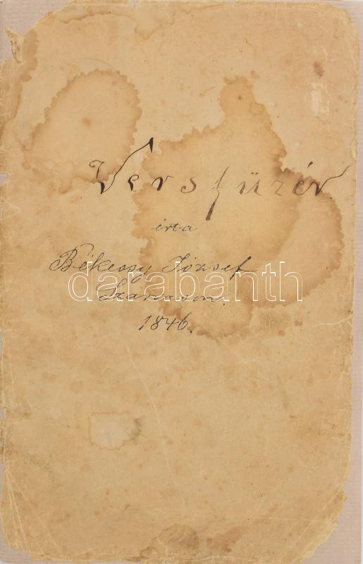 Description: 1846 Versfüzér, írta Békessy József Szarvason, kézirat, 64 beírt oldal, előszóval és tartalomjegyzékkel. Fűzve, javított papírborítóval, kissé viseltes, foltos állapotban.