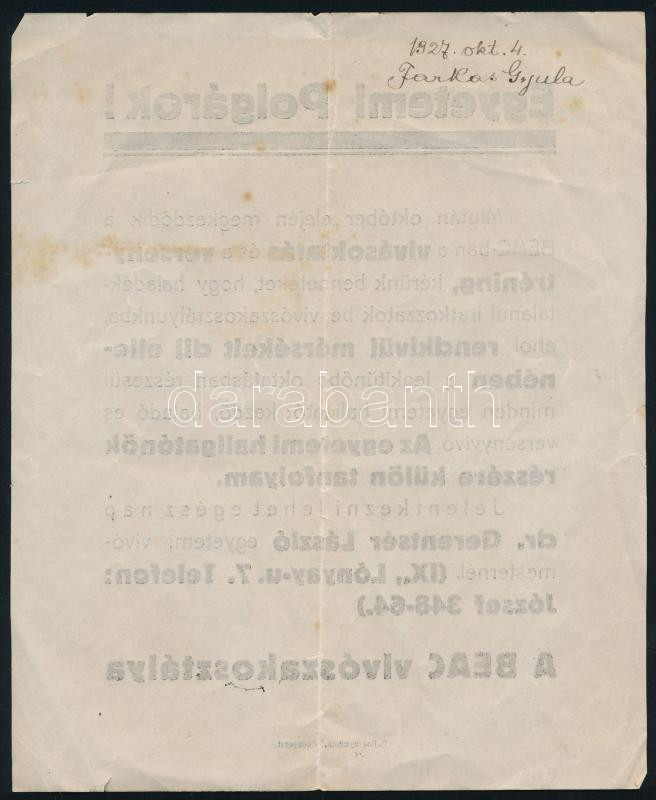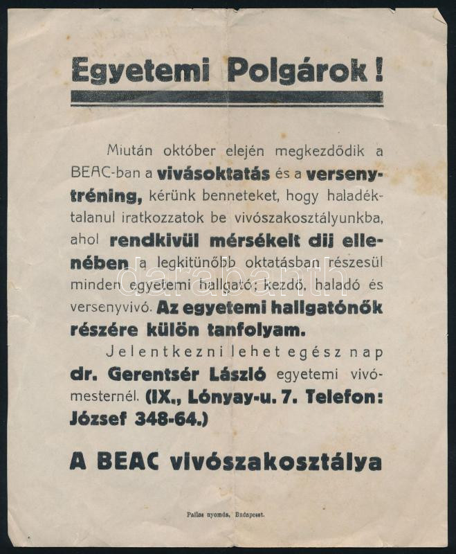 1927 ,,Egyetemi Polgárok!", a BEAC vÃvószakosztályának felhÃvása dr. Gerentsér László vÃvómester által tartott vÃvásoktatási tanfolyamokról. Bp., Pallas-ny., kissé foltos, középen hajtott, a hátoldalon kézzel Ãrt datálással és névbejegyzéssel, 20x16,5 cm