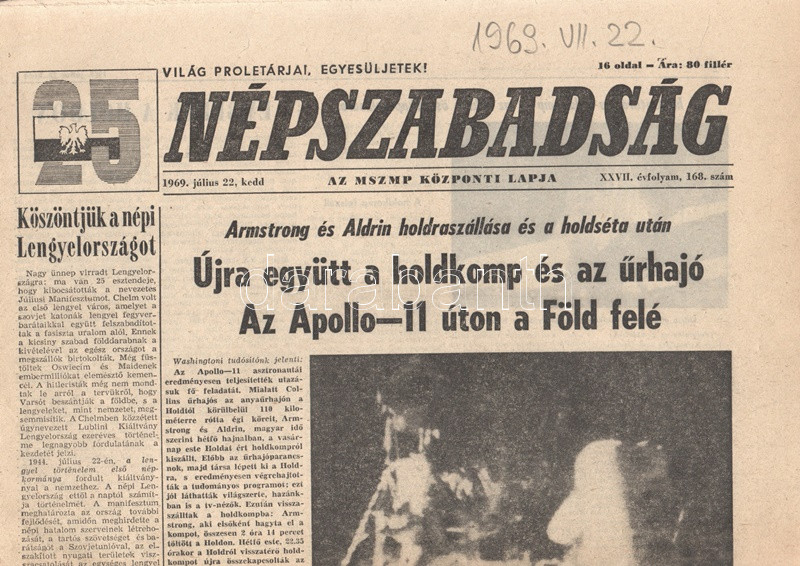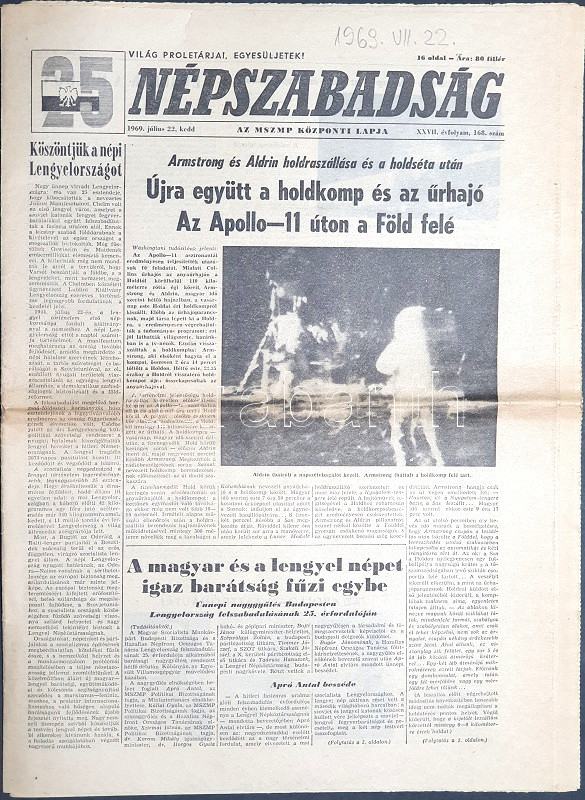 [Folyóirat] "Armstrong és Aldrin holdraszállása és a holdséta után Újra együtt a holdkomp és az űrhajó. Az Apollo-11 úton a Föld felé". A Népszabadság lapszáma az Apollo-11 visszaútjáról. (XXVII. évfolyam, 168. szám, 1969. július 22.) Budapest, 1969. Szikra Lapnyomda. 9 + [7] p. Folio. A második világháborút követően jelentős fegyverkezési verseny kezdődött az Egyesült Államok és a Szovjetunió között. Ennek a versengésnek volt az eredménye a nyugati világot sokkoló Szputnyik-1 műhold fellövése 1957 októberében, melyet a szovjet hírközlés nagy diadallal jelentett be. Jóllehet a szovjetek által fellőtt első műhold nyomán kitört pánik egyebek között a NASA megalakulásához vezetett, 1961. április 12-én Jurij Gagarin másfél órás űrutazásával újabb szovjet diadal született. Mivel az amerikai űrprogram mind az első műhold, mind az első ember űrbe küldésével lemaradásba került. John F. Kennedy amerikai elnök csattanós válaszként 1961. május 25-én a szenátusban meghirdette a Holdra szállási programot. A később Apollo-projektként elhíresült terv szerint még az évtized vége előtt embert kell juttatni a Holdra, és sikeresen vissza is kell hozni onnan. A nagyívű terv sikeréhez azonban rengeteg részlet kidolgozásra szorult. Bár az 1961. május 5-én végrehajtott első amerikai űrutazással kiderült, hogy a kozmikus sebesség, a kozmikus sugárzás és a súlytalanság állapota is túlélhető az emberi szervezet számára, a következő űrutazások során még számtalan vezérlési, kommunikációs, tudományos és egészségügyi kihívásra kellett megoldást találni, illetve meg kellett oldani a Föld kerüli keringés, a hosszú távú űrben tartózkodás, az együttes repülés, az űrséta és az űrrandevú technikai kérdéseit. Az 1961-től kibontakozó Mercury- és Gemini-programok sikere után 1967-től indult a Hold-utazás végső szakaszának programja, az Apollo-program. A tragédiát sem nélkülöző űrprogram döntő része 1967-1969 között zajlott, melynek során az Apollo-űrhajók több alkalommal megközelítették a Holdat, körbe is fényképezték, és kezdettől fogva a két űreszközös megoldást választották, melynek értelmében a Föld-Hold-távolságot megtevő anyaűrhajó Hold körüli pályára áll, és onnan egy másik járművel, egy holdkomppal érik el a Hold felszínét, majd jutnak vissza onnan. Az Apollo-11 űrhajó 1969. július 16-án startolt Floridából, és több napnyi utazás, majd Hold körüli pályára állás után az anyaűrhajóról leválasztott holdkomp 1969. július 20-án, a vasárnap esti órákban érte el a Hold felszínét. Lapszámunk a magyar sajtóban szokatlan alapossággal ismerteti a holdkompban tartózkodó két amerikai űrhajós, Neil Armstrong és Buzz Aldrin holdra szállását, két órán át tartó holdsétáját, a tetteiket rögzítő, hordozható televíziós kamera pozicionálását, a holdjárás óvatosságát, az anyaggyűjtés körültekintő mivoltát, az űrkutatás hősi halottainak emlékét megörökítő emlékplakett, a békefelirat és az amerikai zászló elhelyezését, majd a holdkompba való visszaszállás, az űrruhák fertőtlenítésének részleteit. A beszámoló megörökíti a holdkomp felszállás technikai részleteit is, 18:54-es startjáról az anyaűrhajóba való dokkolás műveletéig (22:35). Lapszámunk röviden ismerteti a további, lapzárta utáni műveleteket is, feltehetően a reggeli órákban indul vissza az űrhajó, és vélhetően csütörtökön, július 24-én ér vissza a Földre. A képekkel kísért beszámoló után a Hold-expedíció eredményeit a szovjet űrkutatás kontextusába emelő véleménycikk, alatta az amerikai Hold-expedícióval egy időben a helyszínen járó, távirányítású, legénység nélküli automata szovjet holdszonda, a Luna-15 eredményeinek kivonatos ismertetése. A további oldalon rövid sajtószemle az Apollo-11 nemzetközi visszhangjáról, meglepően korrekt szovjet köszönetnyilvánítással és elismeréssel, melyet a támadó jellegű londoni sajtóvisszhang ellenpontoz. Jó állapotú lapszám.