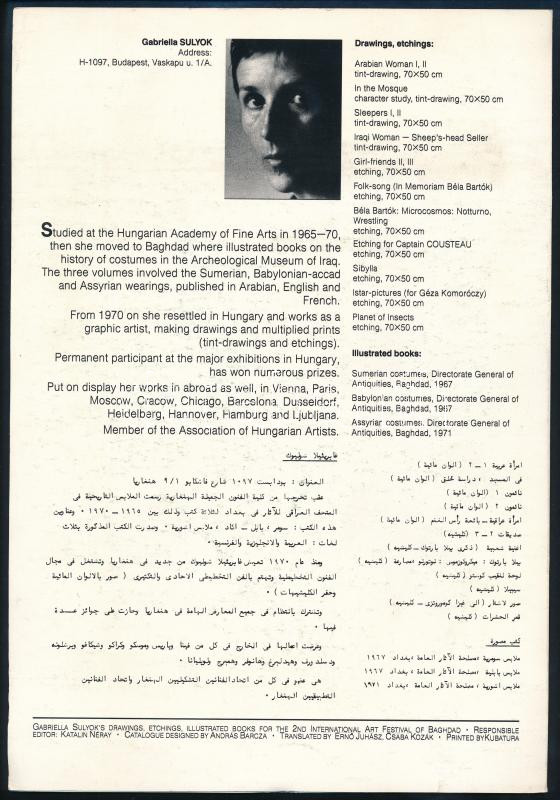 Description: cca 1972 Sulyok Gabriella grafikus kiállítási prospektusa a 2. Bagdadi Nemzetközi Képzőművészeti Fesztiválról (2nd International Art Festival of Baghdad), angol és arab nyelven, kissé koszos borítóval, 2 sztl. lev.