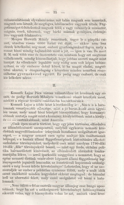 Tóvölgyi Titusz (1838-1918) író, függetlenségi szemléletű hírlapíró szenvedélyes hangú vitairata. A névtelenségben maradó szerző a kiegyezés művét erőszaknak és önfeladásnak tekinti, és támadást intéz a kiegyezés művét védelmébe vevő Horváth Mihály szabadelvű történész személye ellen. A függelékben Tóvölgyi Titusz történelmi áttekintése a magyarellenes Habsburg-vezetés több évszázados bűneiről. Példányunk címlapja és utolsó nyomtatott levele hiányzik, az első előzéken régi könyvkötői könyvjegy.