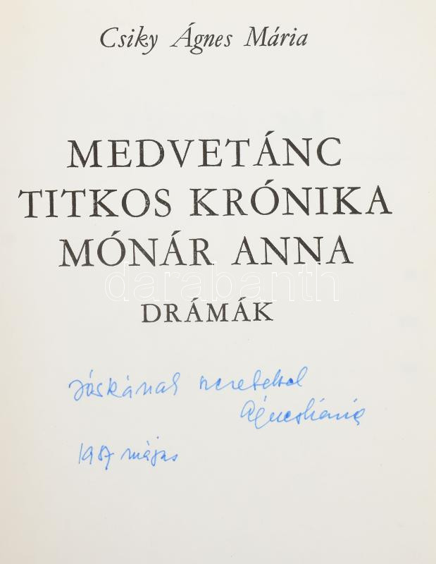 Csiky Ágnes Mária: Medvetánc, Titkos krónika, Mónár Anna. A szerző, Csiky Ágnes Mária (1918-2004) író, költő, műfordító által Molnár József (1918-2009) emigráns magyar író, könyvkiadó, nyomdász, a (Új) Látóhatár folyóirat és az Aurora Kiadó szerkesztője részére DEDIKÁLT példány. Szeged, 1987, Szegedi Nyomda. Kiadói papírkötés.