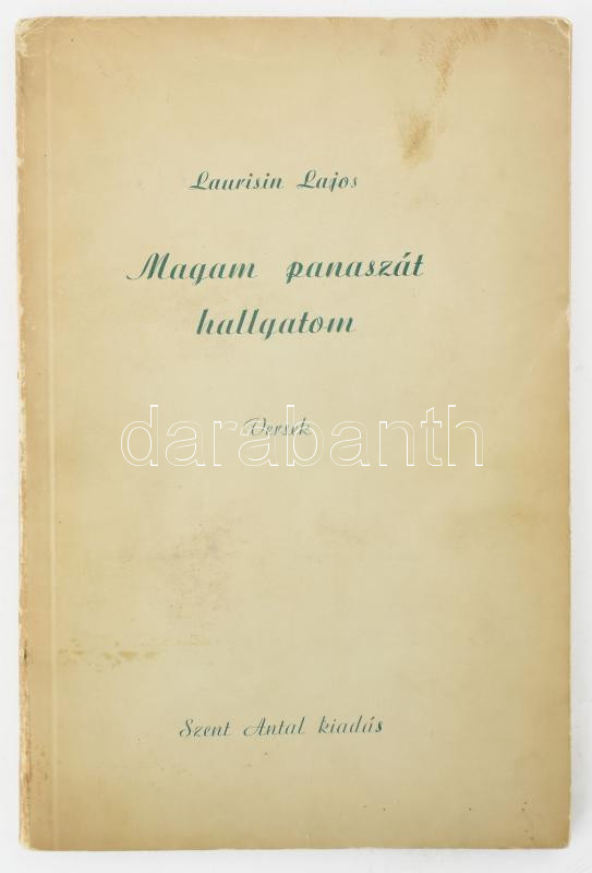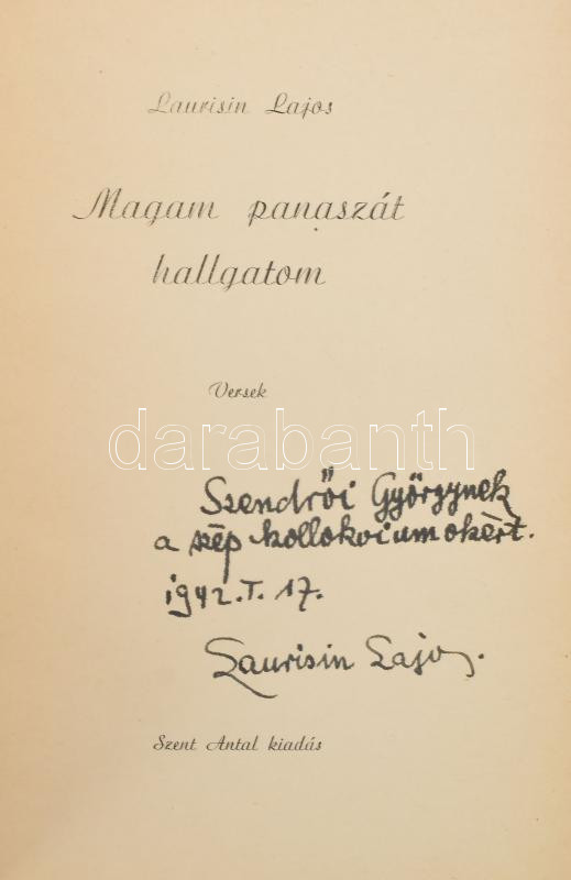 https://www.darabanth.com/en/476-Online-auction/476.0/Books/Books-Other-rarities~1500018/Laurisin-Lajos-Magam-panaszat-hallgatom-Versek-Bp-1942-Szent-Antal-DEDIKALT-62-plus-3p~II3241965
