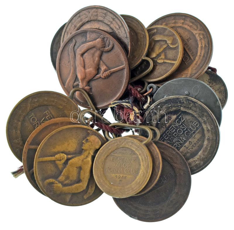 Berán Lajos (1882-1943) 1923-1940. "Ferencz Városi Torna Club" kétoldalas díjérem füllel, közte bronz, bronzozott Al (15db, 2xklf méret: 30mm és 40mm) + 5db klf sportérem egybefűzve T:VF,F
