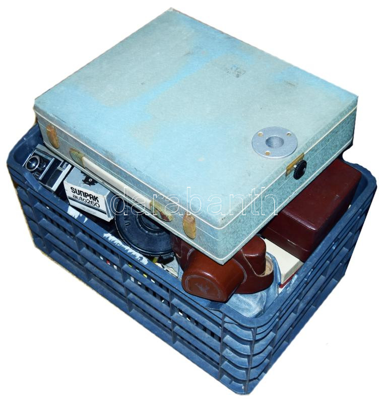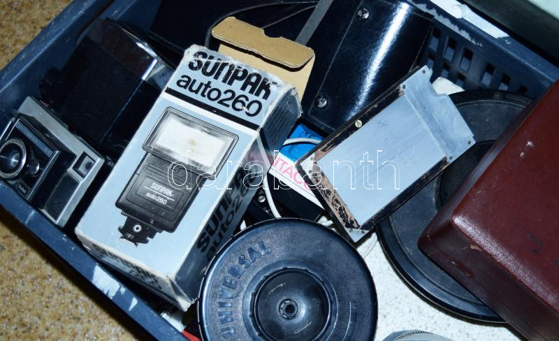 Óriási fotós kellék tétel: nagyító, laboridőzítő, előhívótankok, nagyon sok színszűrő, vágógép, stb, + néhány sérült kamera