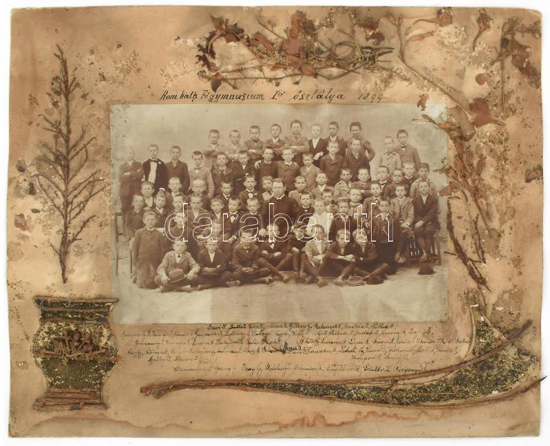 1899 Róm. kath. Főgymnasium I-ső osztálya, tablófotó, nevesítésekkel, egyedi, szárított növény applikációkkal díszített kartonon, viseltes állapotban, 30x24,5 cm