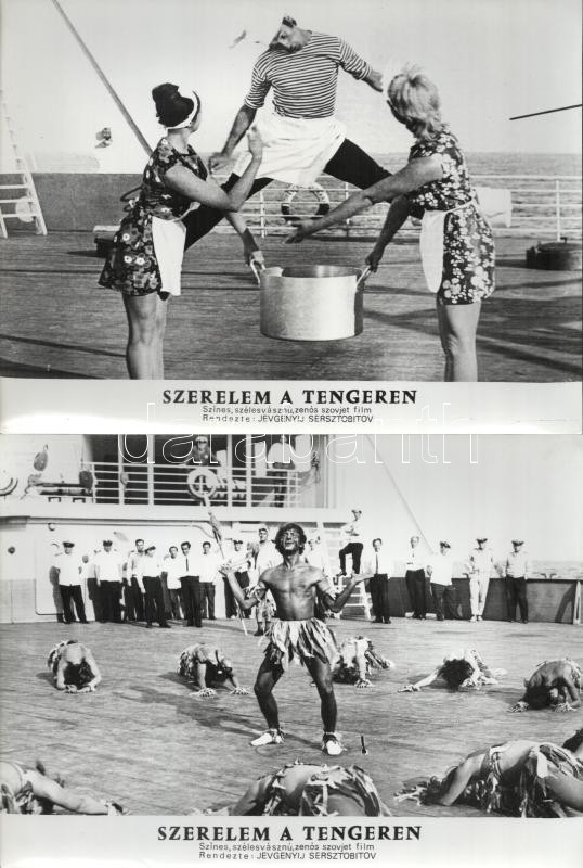 Description: cca 1989 előtt készült, ,,Szerelem a tengeren" című szovjet film jelenetei és szereplői, 14 db vintage produkciós filmfotó (vitrinfotó, lobbyfotó) ezüst zselatinos fotópapíron, a használatból eredő (esetleges) kisebb hibákkal, 18x24 cm