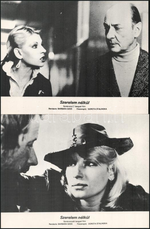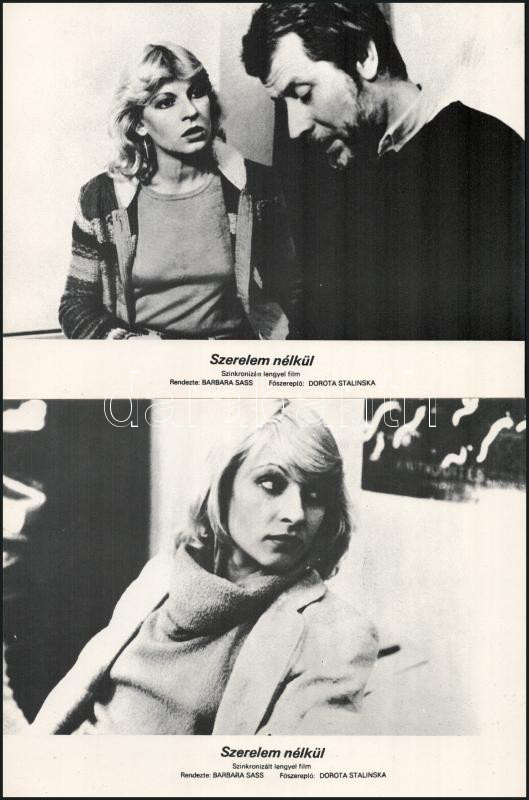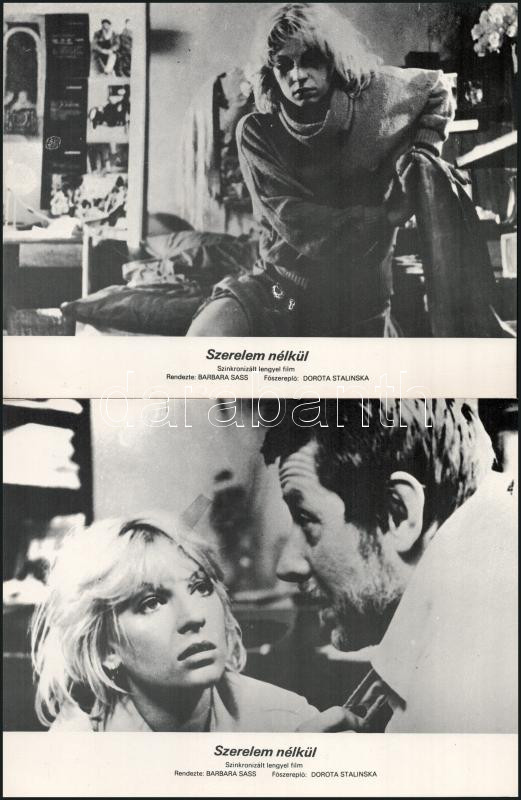 cca 1989 előtt készült, ,,Szerelem nélkül" című lengyel film jelenetei és szereplői, 8 db produkciós filmfotó (vitrinfotó, lobbyfotó) nyomdatechnikával sokszorosítva kartonpapírra, egyoldalas nyomással, a használatból eredő (esetleges) kisebb hibákkal, 18x24 cm