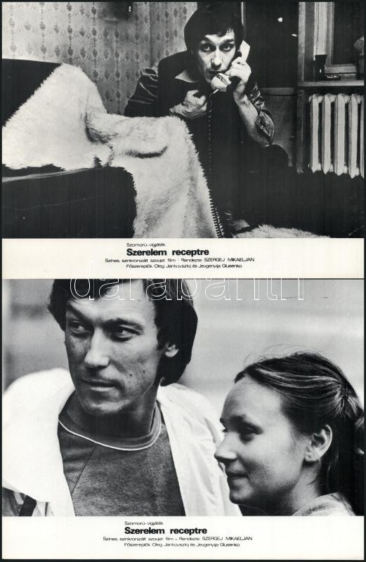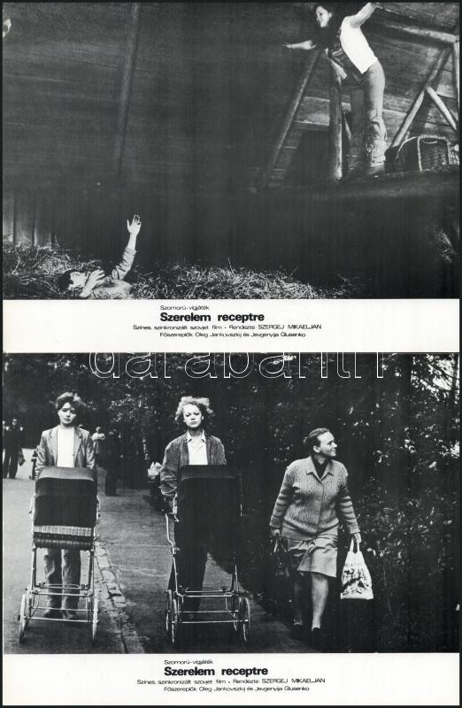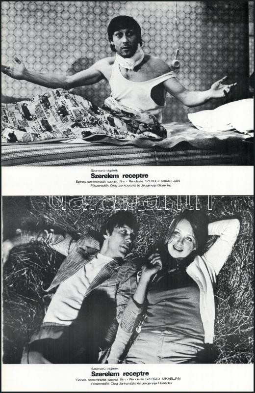 cca 1989 előtt készült, ,,Szerelem receptre" című szovjet film jelenetei és szereplői, 9 db produkciós filmfotó (vitrinfotó, lobbyfotó) nyomdatechnikával sokszorosítva kartonpapírra, egyoldalas nyomással, a használatból eredő (esetleges) kisebb hibákkal, 18x24 cm