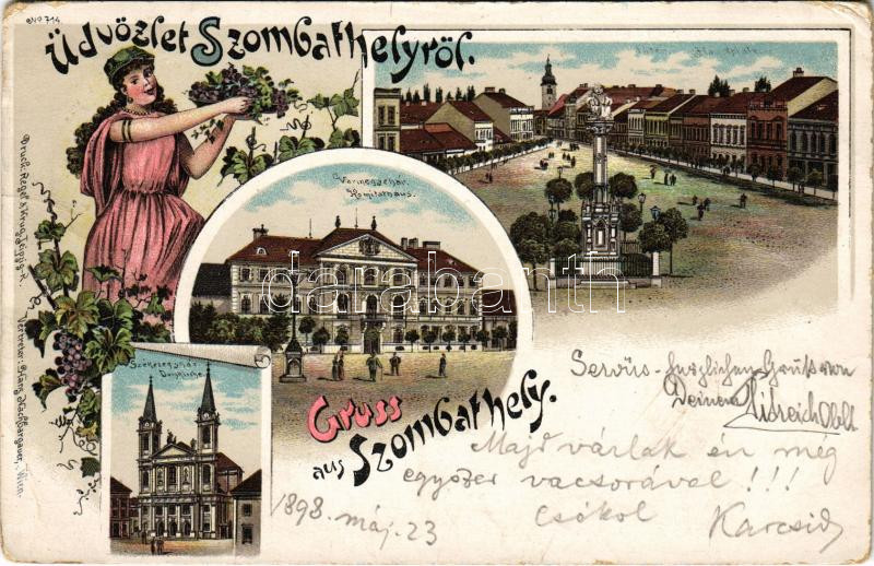 1898 (Vorläufer) Szombathely, Vármegyeháza, Székesegyház, Fő tér, szőlős hölgy. Druck Regel & Krug Art Nouveau, floral, litho (EB)