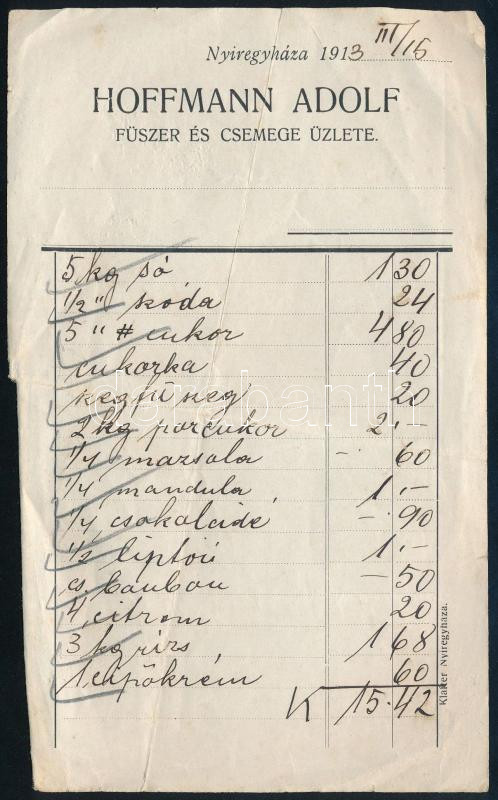 1913 Nyíregyháza Hoffmann Adolf fűszer és csemegeüzlet számla