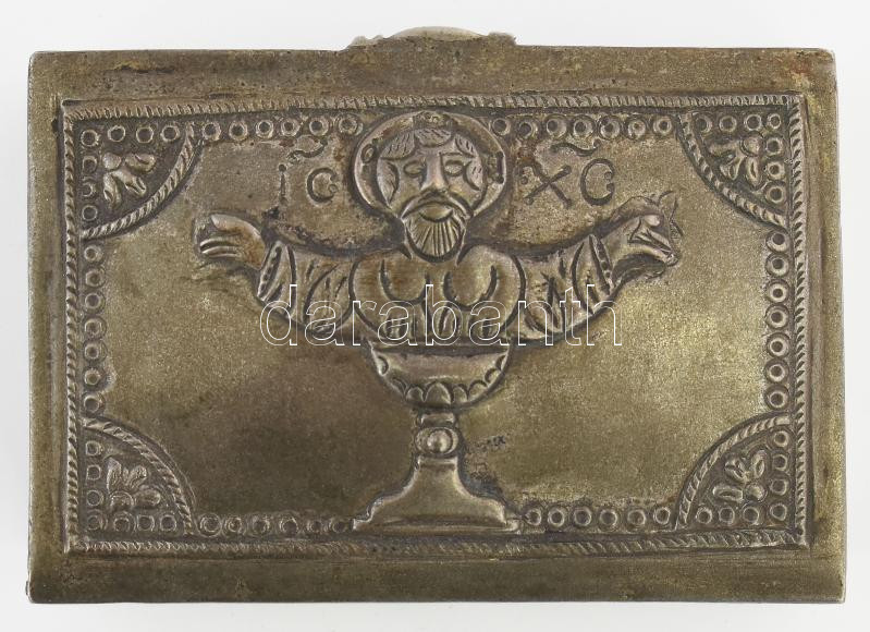 cca 19. sz., Ortodox szentkenet feladó utazó készlet. Gravírozott feliratokkal, 9x6x3 cm