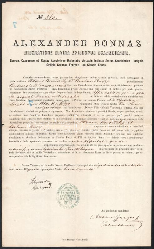 Bonnaz Sándor (1812-1889) csanádi püspök autográf aláírása fejléces le...