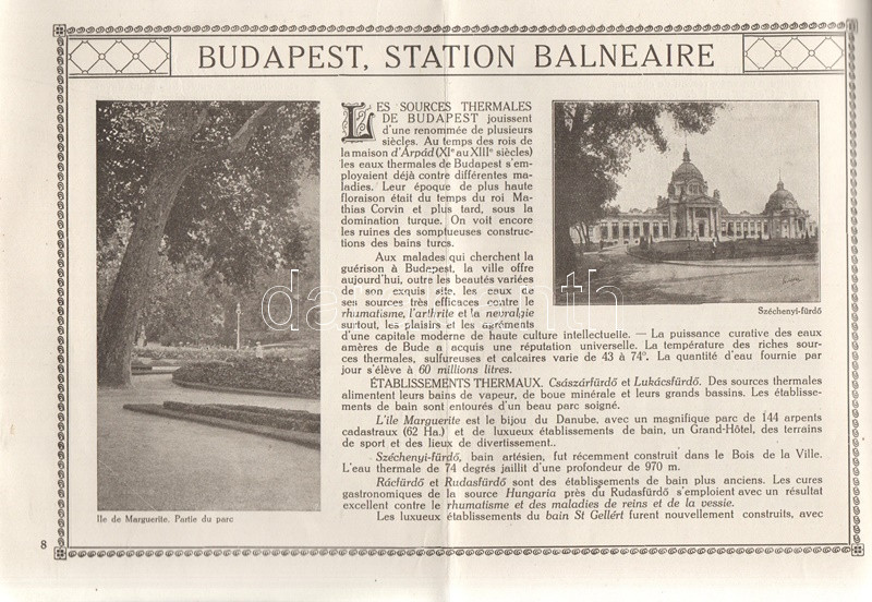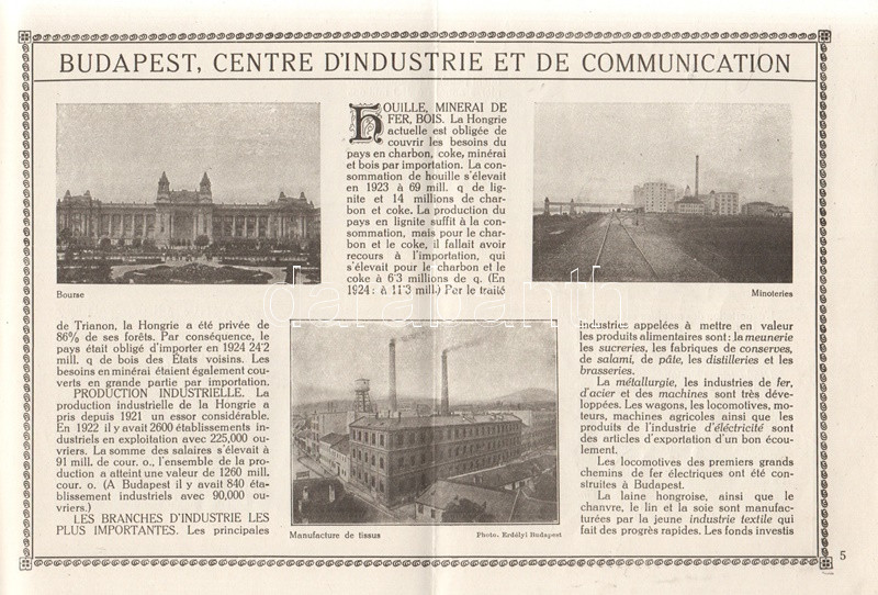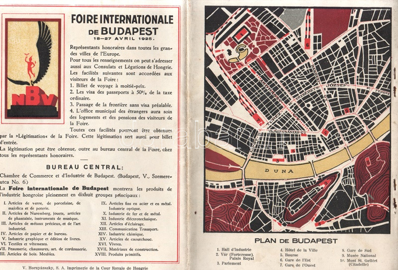 Foire Internationale de Budapest 18-27 Avril 1925. [Az 1925. évi Budapesti Nemzetközi Vásár francia nyelvű turisztikai és tájékoztató füzete.] Budapest, 1925. Hornyánszky Viktor ny. 26 p. Az először 1925-ben megrendezett Budapesti Nemzetközi Vásár jelenős előéletre tekinthet vissza. Ha nem tekintjük az inkább országimázsra törekvő Ezredéves Kiállítást, illetve a mezőgazdasági vásárokat, akkor a BNV előfutárának az 1906-ban Fővárosi Kereskedők Egyesülete által megrendezett Márciusi Vásárt tekinthetjük, amelyen leginkább a papírkereskedők mutatták be termékeiket. Az árumintavásárnak minősülő 1906-os vásár nagy sikernek bizonyult, profilja folyamatosan bővült, és kikerült a pesti Vigadó épületéből. Bár korábban is megjelentek már külföldi kiállítók, de az első valódi nemzetközi vásár az 1925. évi volt, melyet jelentős szervező és propagandamunka előzött meg. Francia nyelvű turisztikai és vásárismertetőnk is a szervező munka keretében jelent meg. Szövegközti felvételekkel gazdagon illusztrált tájékoztatónk első felében Budapesti infrastrukturális, turisztikai, közlekedési, ipari és kereskedelmi fejlődéséről, modern építészeti örökségéről szóló cikkek, a második részben egyes kiállítók képes hirdetései. A kihajtható hátsó borítón a BNV színes emblémájával illusztrált információk, illetve színes Budapest-térkép az állomásoktól a városligeti kiállítótérhez vezető útvonalak részleteivel. Fűzve, színes, illusztrált kiadói borítóban. Jó példány.