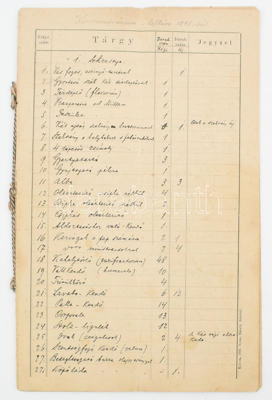 1896 Boromissza Tibor leendő szepesi püspök által aláírt kalocsai leltárjegyzék