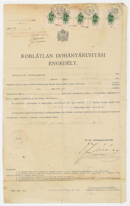 1941, Szatmárnémeti, Nagykárolyi kocsma korlátlan dohányárusítási engedélye, bélyeggel