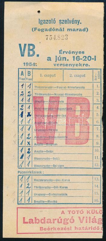 1954 Labdarúgó Világbajnokság igazoló szelvény, amely a fogadónál marad, Aranycsapat - VB döntő