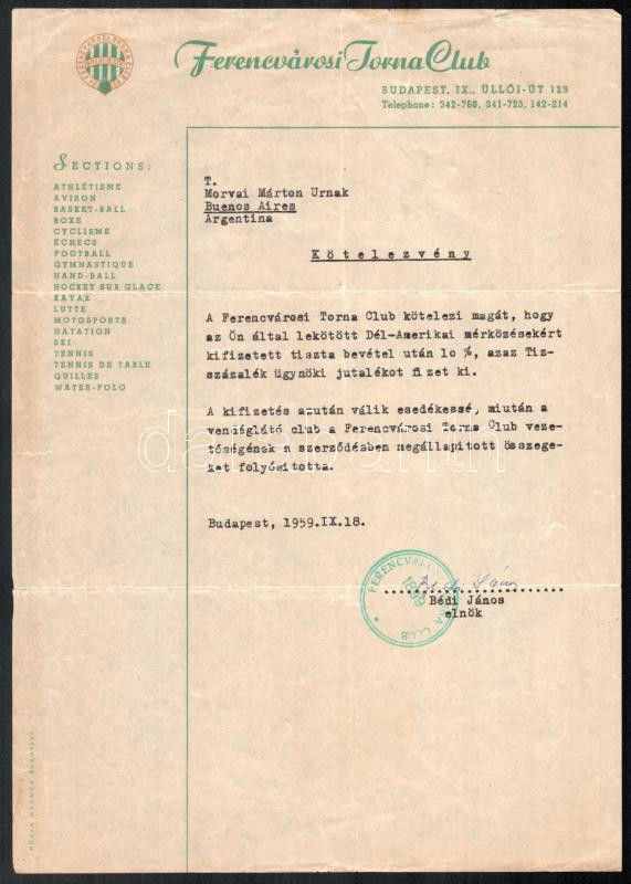 Description: 1959 Bédi János (1914-1996) egykori labdarúgó, egykori ÁVH-s tiszt (1951- Rajk perig), az FTC elnöke (1958-1962) 1958-tól 1962-ig, FTC kötelezvény, FTC fejléces papíron