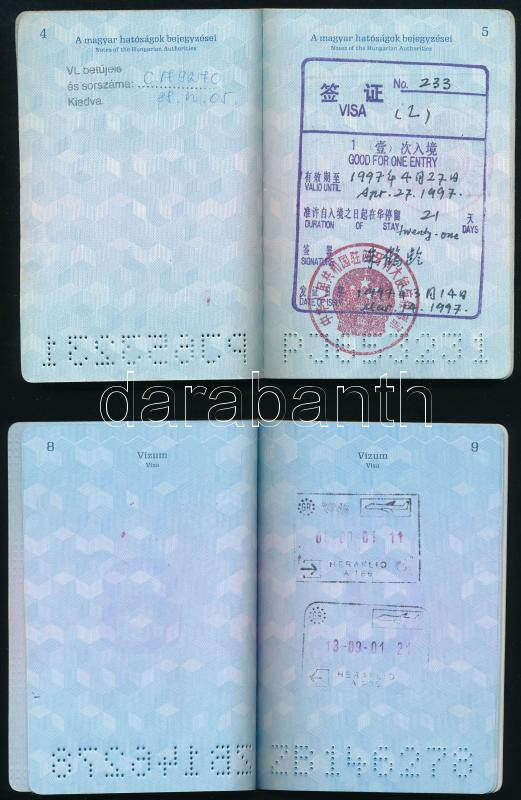 1995, 2000 Magyar Köztársaság által kiállított 2 db útlevél svájci, ciprusi, osztrák, stb. vízum- és utazási bélyegzők