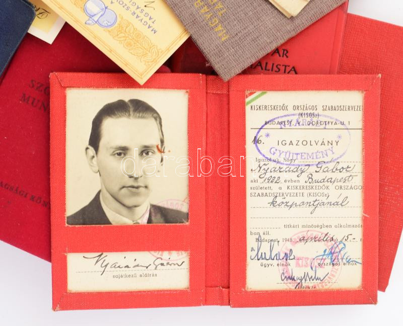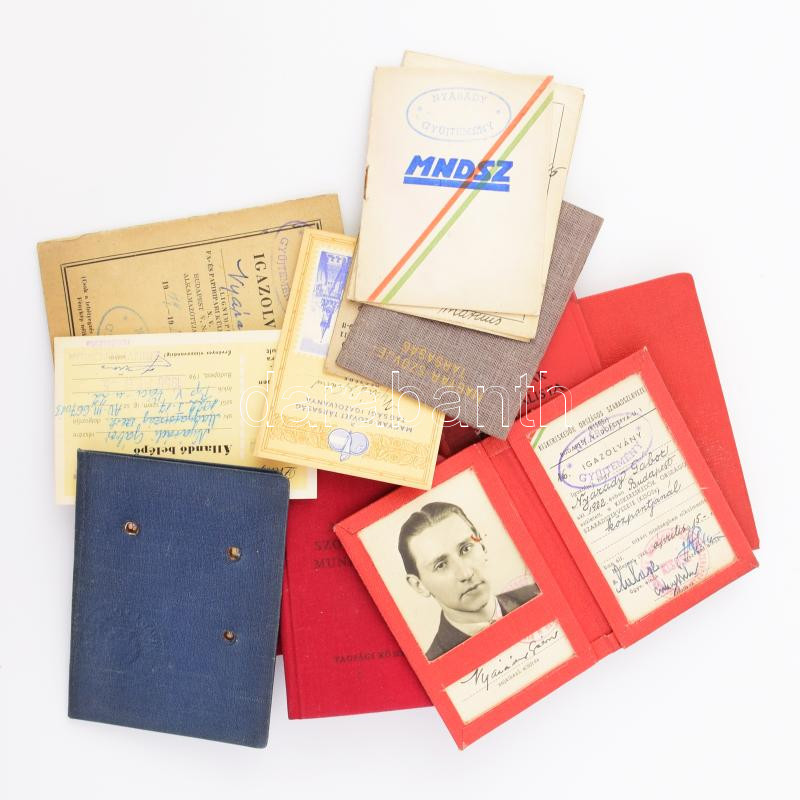 Description: Nyárády Gábor (1922-2003) író, újságíró, a Magyarország tudományos rovatának egykori vezetője okmány hagyatéka: újságíró és egyéb igazolványai, fényképes igazoványok, MNDSZ tagsági, tanulmányi könyvek, stb. 14 db