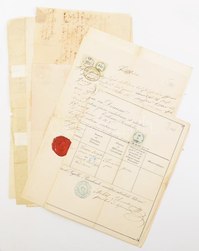 cca 1805-1870 10 db anyakönyvi kivonat, egyéb plébániai okmány viaszpe...