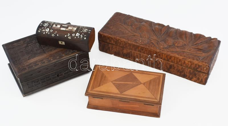 4 darab fa doboz, közte faragott, gyöngyház berakással, sérüléssel, klf méretben