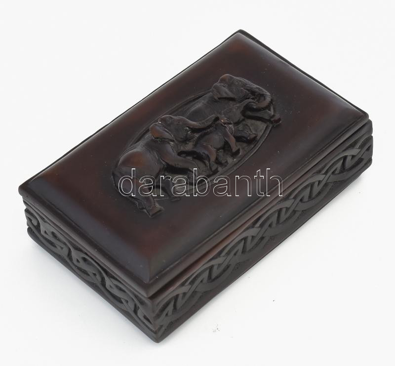 Vonuló elefántok ábrázolásával díszített keleties rezin bonbonier, 16x10 cm