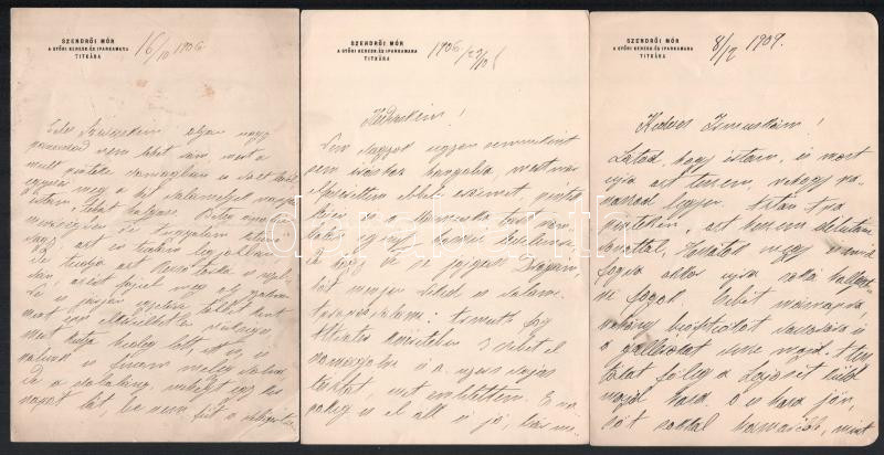 1906-1909 Szendrői Mór (1853-1929), a Győri Kereskedelmi és Iparkamara titkárának fejléces levélpapírjára írt 3 db levél