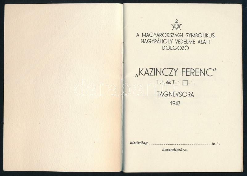 1947 A Magyarországi Symbolikus Nagypáholy védelme alatt dolgozó ,,Kaz... https://www.darabanth.com/en/477-Online-auction/477.0/Art-and-other-collectibles/Historical-documents-manuscripts~1000024/1947-A-Magyarorszagi-Symbolikus-Nagypaholy-vedelme-alatt-dolgozo-Kazinczy-Ferenc-t-es-t-ta~II3251056