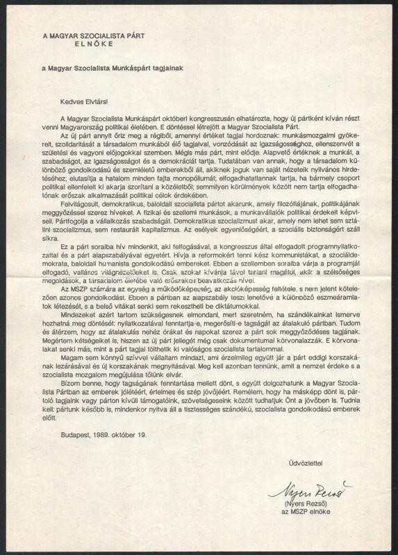 1989 Nyers Rezső Magyar Szocialista Párt elnöke körlevele a Magyar Szocialista Munkáspárt tagjainak, 1989. okt. 19.