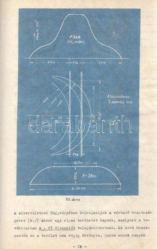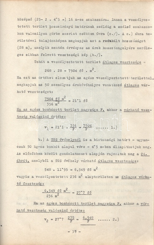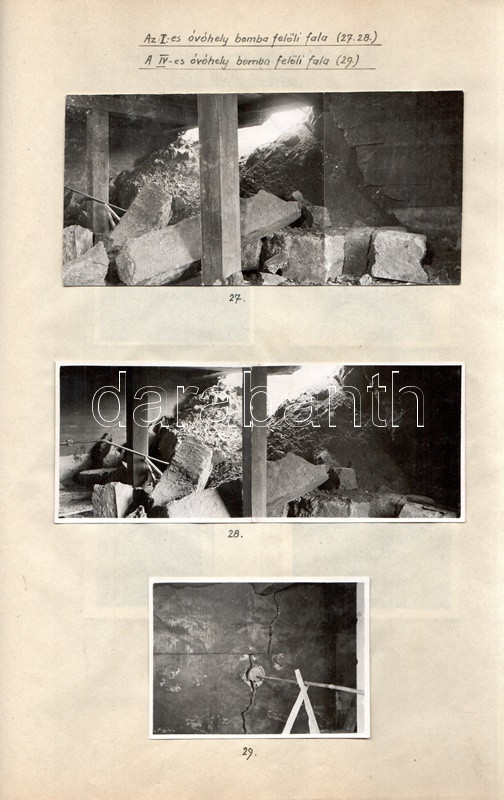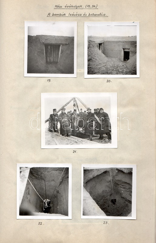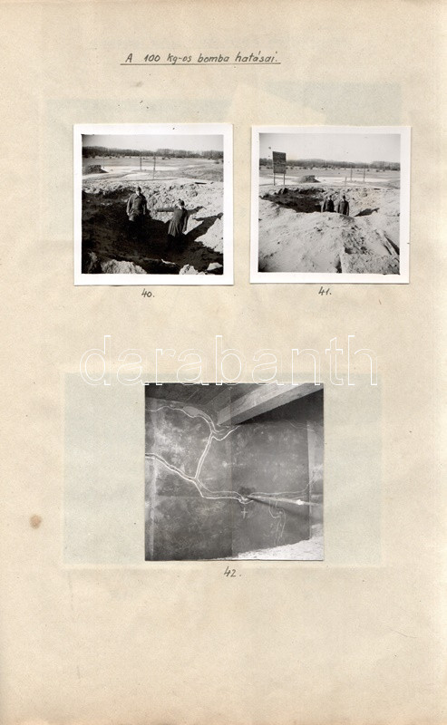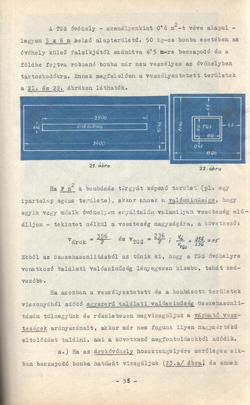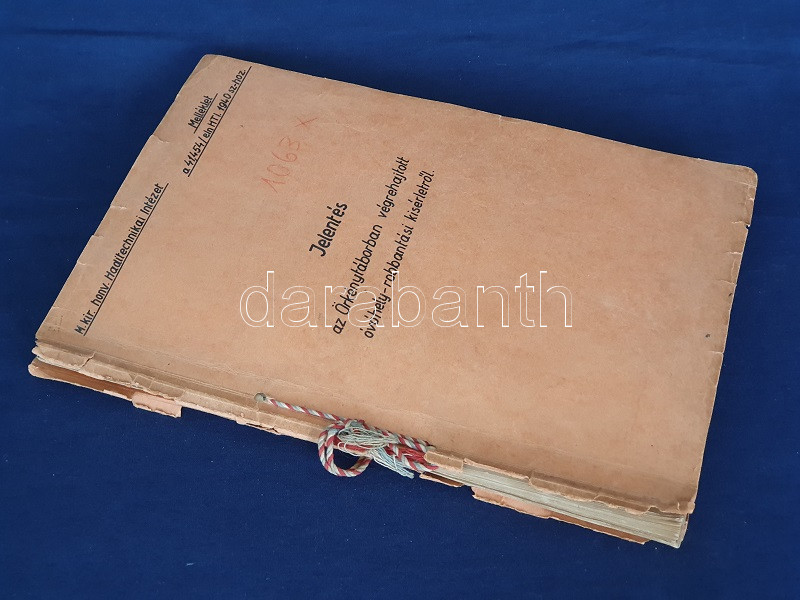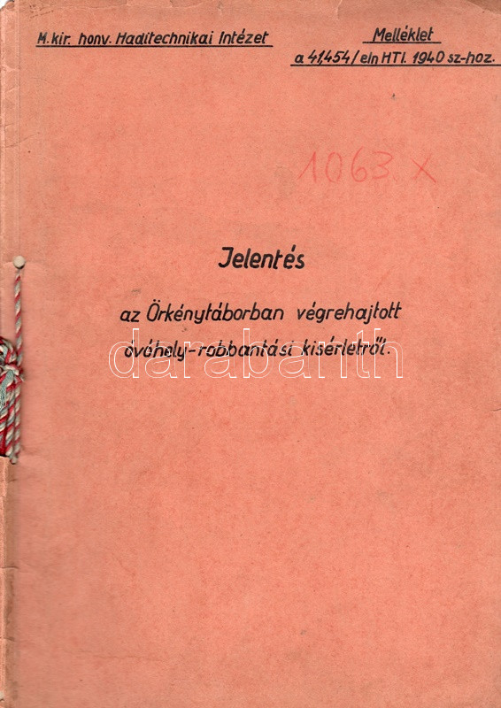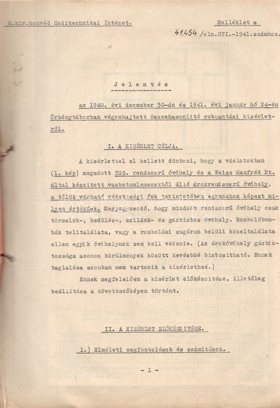 [Kézirat] ,,Jelentés az Örkénytáborban végrehajtott óvóhely-robbantási kÃsérletrÅ‘l". A Magyar Királyi Honvéd Haditechnikai Intézet jelentése - A jelentés összefoglalása a honvédelmi miniszternek cÃmezve [AláÃrt] (1941). Kelt: Budapest, 1941. február 24. 43 + [1] levél + 11 t. (fotómelléklet) terjedelmű gépirat + 1 melléklet (2 levél terjedelmű aláÃrt). A Pest megyei Örkény és Táborfalva határában levÅ‘ terület 1875 óta a honvédség kezelésében áll, és lÅ‘- és gyakorlótérként szolgál. A második világháború korai éveiben, a jövÅ‘ben esedékes hadba lépés nyomán várható légitámadások polgári és gazdasági veszteségeit csökkentendÅ‘ a Honvéd Haditechnikai Intézet óvóhely-robbantási kÃsérleteket végzett. Az 1940. december 30-án és 1941. január 24-én végrehajtott robbantási kÃsérletek azt vizsgálták, hogy a már korábban szabványosÃtott TGS rendszerű óvóhely [törmelék, gáz és szilánk elleni védelmet nyújtó óvóhely], illetve a Weiss Manfréd Rt. által fejlesztett, vasbeton elemekbÅ‘l épÃtett árokrendszerű óvóhely védelmi potenciálja mennyiben tér el. Műszaki rajzokban, robbantási ábrákban gazdag jelentésünk az elvégzett robbantások nyomán dokumentálja a két óvóhely-rendszer védelmi képességeit, és megállapÃtja, hogy a különbség elhanyagolható, az 50 fÅ‘ védelmét szolgáló TGS-rendszerű óvóhely 21, az 50 fÅ‘ védelmét szolgáló árokrendszerű óvóhely 27 életet kÃmél meg. A jelentés továbbá javaslatot tesz a TGS rendszerű óvóhelyek belsÅ‘ berendezésére (a falak mellett tilos fekvÅ‘helyeket kialakÃtani), illetve az árokrendszerű óvóhelyek vonalvezetésére (a 120 fokban megtört szakaszokban épÃtett árokrendszer nyújtja a legnagyobb védelmet). A dokumentum egykori tulajdonosa több szövegkiemelést, lapszéli kommentárt helyezett el, illetve 16 betétlapon fűzte tovább kommentárjait a jelentéshez. A folyószöveg után részletes épÃtési és robbantási fotódokumentáció. A jelentés eredményeit foglalja össze a dokumentumhoz csatlakozó, aláÃrt kÃsérÅ‘levél, melyben a jelentéstevÅ‘ a már megépült TGS rendszerű óvóhelyek átalakÃtását javasolja a kÃsérlet eredményei fényében, másfelÅ‘l a nagyobb biztonságot jelentÅ‘ árokrendszerű óvóhelyek kialakÃtását sürgeti. Nemzeti szÃnű zsinórral fűzött, feliratozott, enyhén sérült korabeli borÃtóban. A tűzött kÃsérÅ‘levél jobb szélén apró gyűrÅ‘dések.
