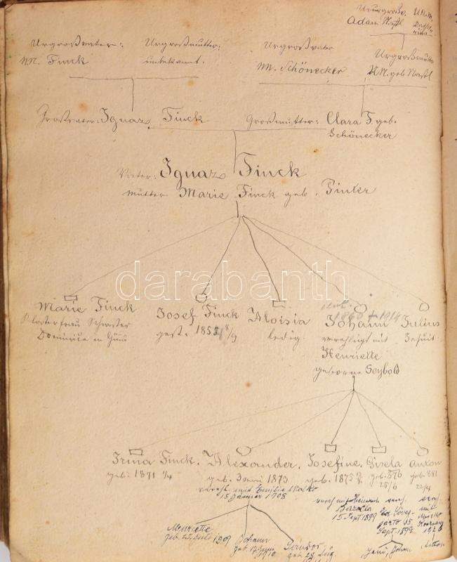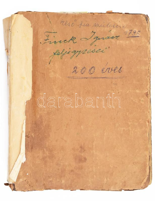cca 1780-1910 Finck Ignác, soproni kereskedő és Fényi Gyula - híres jezsuita szerzetes, csillagász - apjának naplója. A kötet egyszerre tartalmaz személyes jellegű naplóbejegyzéseket, szerződéseket és pénzügyi feljegyzéseket. A kötetben fellelhető genealógiai bejegyzések mellett, hátul beírásra került a híres csillagász testvérének, ifj. Finck Ignácnak családfája az 1910-es évekig vezetve. A kötet címoldala szerint 1805-től vezették a naplót 1811-ig, de az első bejegyzés 1802-ben íródott. 1805-ben és 1806-ban rövid leírások készültek Bonaparte Napóleonról és a fontosabb nemzetközi eseményekről. A kötet kb. 350 oldal, amelyből nagyjából 200 a beírt oldal a napló vége felé található elszórt bejegyzésekkel együtt. Több kéz írása látható, a 17. oldalon pedig Finck Ignác saját kezű aláírása.