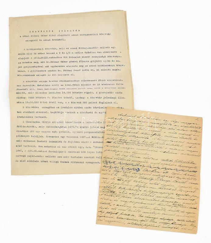 cca 1910 Könyvaukciós bemutatkozó szöveg, beszéd, kézzel írt részlete. Pastinszky Lajos? Egy beírt oldal, + Szakértői jelentés a néhai Prónay Gábor által alapított acsai hitbizományi könyvtár anyagáról és annak értékéről. 8 p.