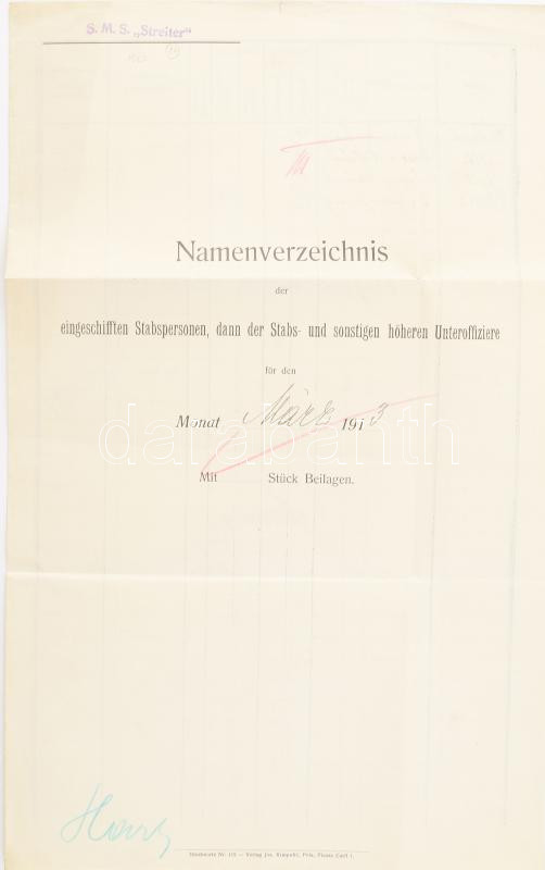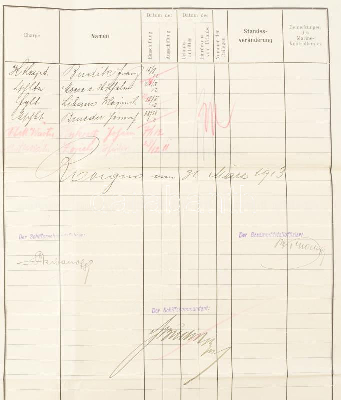 1913 Az S.M.S. Streiter osztrák-magyar hadihajó kimutatása az márciusban fedélzetre lépett személyekről. A parancsnok aláírásával és a hajó pecsétjével, alul részletezve a személyek /Namenverzeichnis der eingeschifften Stabspersonen, etc. for the month of March 1913. Four-page document signed in Rovigno on March 31, 1913. by the Officer in Command, Seal: S.M.S. ,,Streiter" Kalis/Kohl No. 1 [type DL 1c] violet Page two lists the folowing officers who were serving on or visited S.M.S. Striter during the month: Korvettenkapitän Franz Budik (born in 1870, gazetted Linienschiffsleutnant on January 1, 1899; Linienschiffskapitän November 1, 1916). Linienschiffsleutnant Wilhelm Ritter Moese von Nollendorf (born in 1885, gazetted Fregattenleutnant on November 1, 1907; Linienschiffsleutnant May 1, 1912) Fregattenleutnant Maximilian Libano (gazetted Seekadet on July 1, 1907; not found in the 1917 Rangliste)