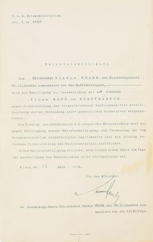 1918 Frank Viktor százados, a repülőcsapatok parancsnokának házassági engedélye