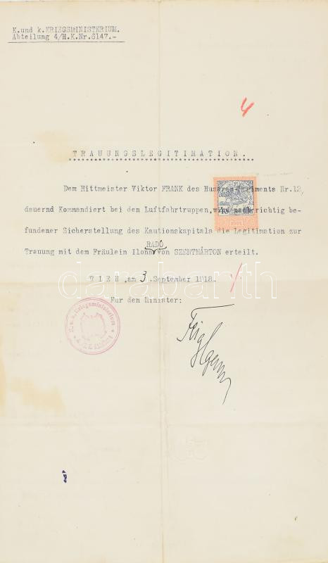https://www.darabanth.com/en/477-Online-auction/477.0/Art-and-other-collectibles/Military~2000009/1918-Frank-Viktor-szazados-a-repulocsapatok-parancsnokanak-hazassagi-engedelye~II3249700