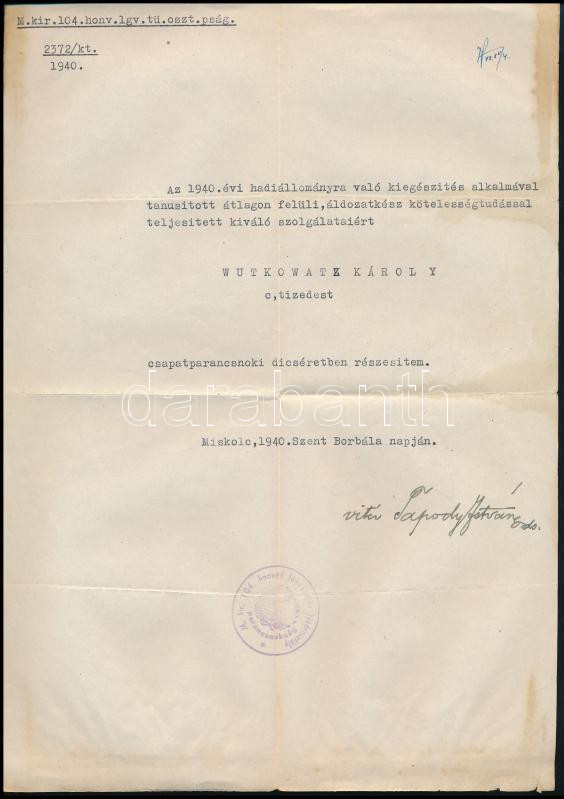 1940 Miskolc, Csapatparancsnoki dicséret vitéz Tapody István ezredes aláírásával