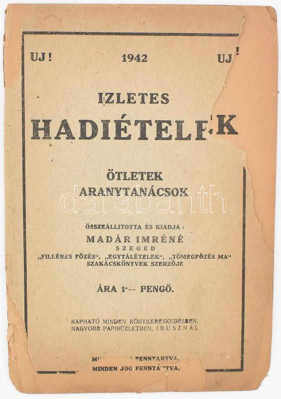 1942 Ízletes hadiételek. Ötletek, aranytanácsok. Összeállította és kiadja: Madár Imréné. Szeged, Szeged Uj Nemzedék Lapvállalat Rt., 48 p. Papírkötés, szakadt, sérült.