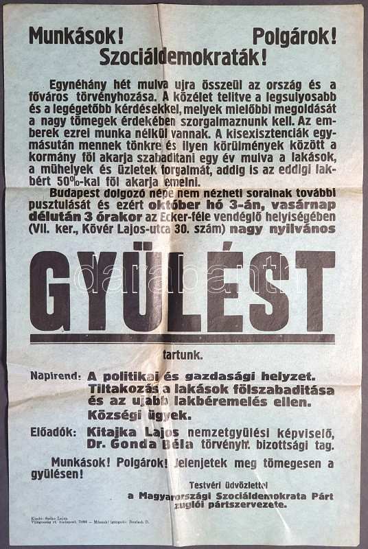 [Plakát] ,,Munkások! Polgárok! Szociáldemokraták! Egynéhány hét múlva újra összeül az ország és a főváros törvényhozása. Budapest dolgozó népe nem nézheti sorainak további pusztulását és ezért október hó 3-án az Ecker-vendéglő helyiségében nagy nyilvános gyűlést tartunk" A Szociáldemokrata Párt zuglói pártszervezetének utcai hirdetése az 1926. évi országgyűlési és önkormányzati választások idején. (1926) Budapest, 1926. Világosság Rt. ny. Választási hirdetés, mérete: 475x310 mm. A Magyarországi Szociáldemokrata Párt sorsa viharosan alakult a Tanácsköztársaság ideje alatt és után, a kommunistákkal való egyesülés ellen az MSZDP számos vezetője tiltakozott, sokuk el is hagyta az országot. Vezetőik másik részét pedig a Tanácsköztársaság bukása utáni átmeneti kormány ítélte száműzetésre. Az 1919-1920-as időszak ügyvezető kormányai ugyan jog szerint nem tiltották be az MSZDP-t, ám tagjaik és vezetőik módszeres ellehetetlenítése folytatódott. Tiltakozásképpen az MSZDP a Horthy-korszak első parlamenti választását bojkottálta. Az 1920 végi választással kormányra kerülő Bethlen István miniszterelnök a belpolitikai helyzet konszolidálására törekedett, így a rendszer erős ellenzékének számító szociáldemokraták vezetőjével 1921 decemberében egyezséget kötött (Bethlen-Peyer-paktum). Ennek jegyében a következő országgyűlési és törvényhatósági városi választásokon a MSZDP már indulhatott, választási programját bizonyos korlátozásokkal, de terjeszthette, valamint olyan megállapodás is született, hogy az MSZDP a parlamenti mandátumok 10%-ánál többet nem birtokolhat. Az 1922-es választáson az MSZDP így 25 képviselőt küldhetett az országgyűlésbe, és ezt követően 1944-ig folyamatosan volt parlamenti képviselete. Választási plakátunk az 1926 decemberére meghirdetett országgyűlési és budapesti önkormányzati választások korszakából származik. Az MSZDP plakátja a lakásínséget tartja a nyomorúság egyik forrásának - korabeli információk szerint az alapbér 60%-át is elérhette a bérleti díj összege, és a késedelmesen fizető lakókat a bérbeadók türelmi idő nélkül utcára tehették, továbbá a lakbéreket markánsan emelhették. Az 1926. október 3-i választási gyűlésre hívó plakátunk napirendjén így főképpen a húsba vágó kérdésnek számító lakásínség kérdése szerepelt. Jó állapotú plakát, hajtogatva.