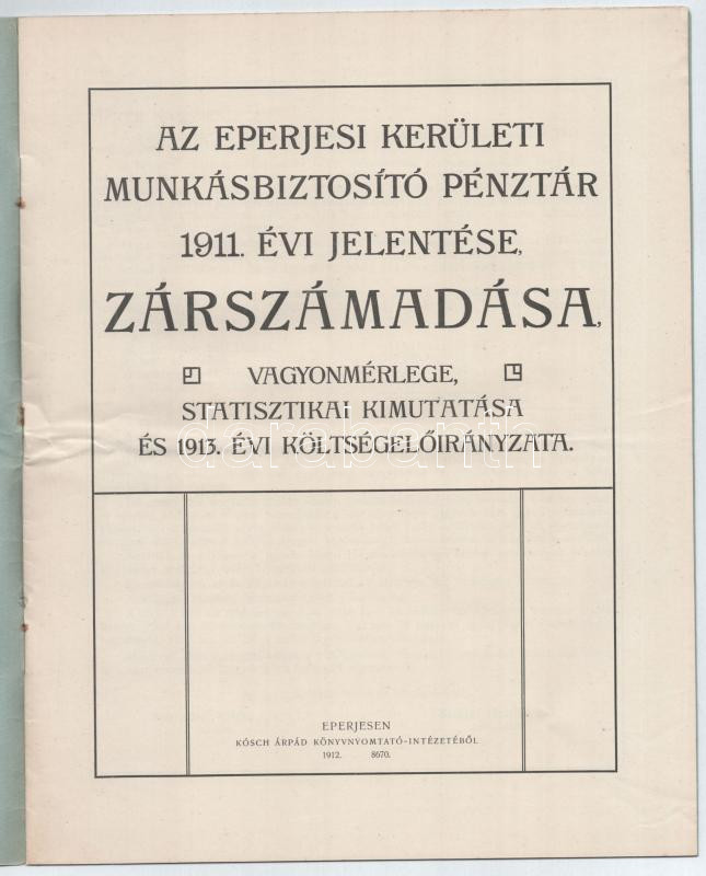 1912 Az eperjesi kerületi munkásbiztosító pénztár 1911. évi jelentése, zárszámadása, vagyonmérlege, statisztikai kimutatása és 1913. évi költségelőirányzata. Eperjes, 1912, Kósch Árpád-ny., 14+(2) p. Kiadói tűzött papírkötés.