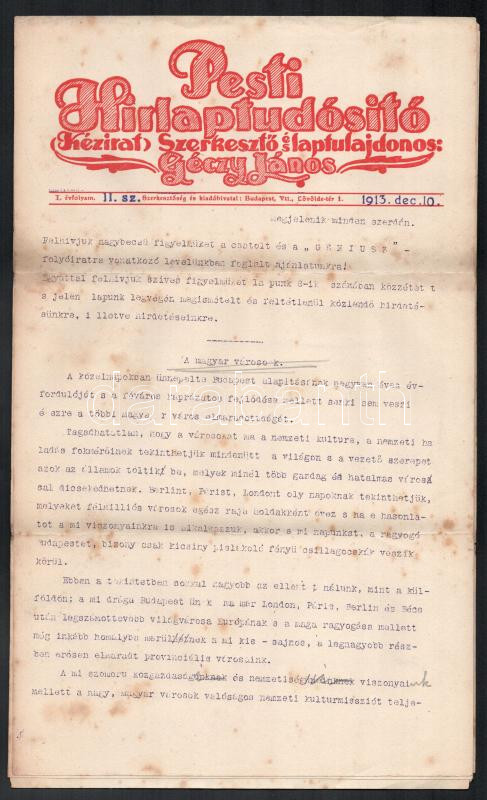 1913 Pesti Hirlaptudósító I. évf. 11. sz., 1913. dec. 10., gépirat, 12 gépelt oldal, hajtott, foltos.