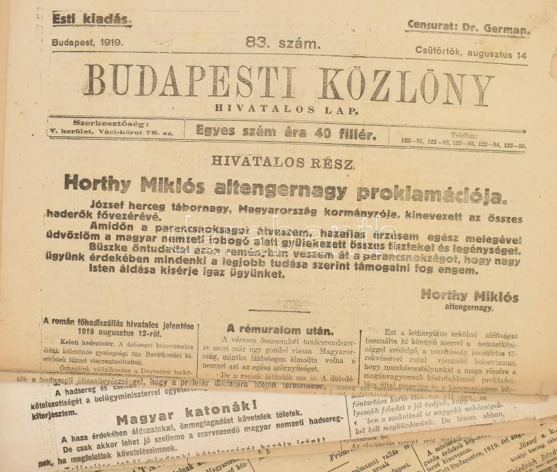 1919 Román megszállás Budapesten, Horthy és a Nemzeti Hadsereg felemelkedése 15 db cenzúrázott újság Reggeli Hírek, Esti Hírek, Budapesti Közlöny.