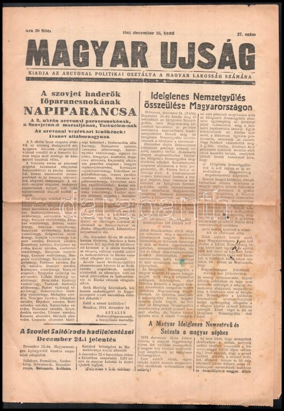 1944 A Magyar Ujság c. folyóirat Kiadja a Magyar Arcvonal a magyar lakosság számára. 27. szám. (december 26.) az ideiglenes nemzetgyűlés összeüléséről