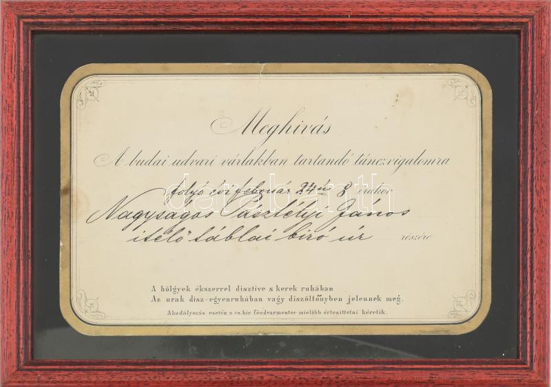 cca 1880 ,,Meghivás a budai udvari várakban tartandó tánczvigalomra", Pásztélyi János ítélőtáblai bíró részére, üvegezett fakeretben, 19x12 cm