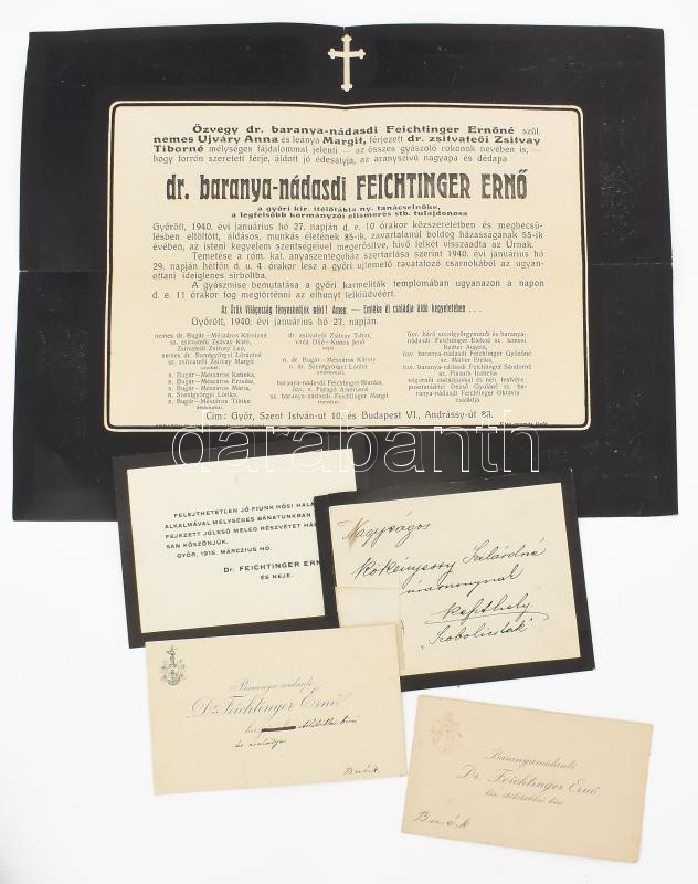 cca 1940. dr. baranya-nádasdi Feichtinger Ernő bíró névjegykártyái és gyászjelentése