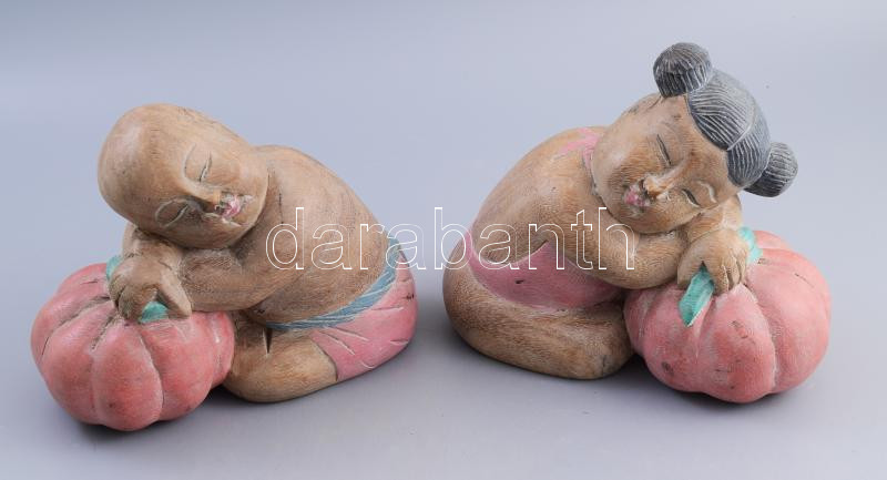 Tökön pihenő kínai gyermek pár. Faragott és festett fa, jelzés nélkül, h: 22 cm