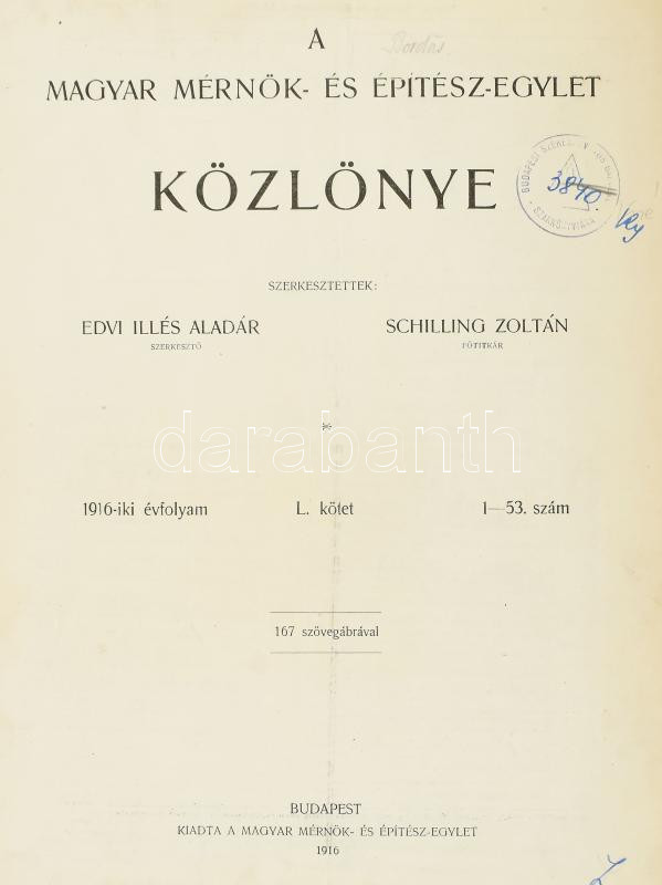 1916 Magyar Mérnök- És Építész-Egylet Közlönye. Szerk.: Edvi Illés Aladár, Schilling Zoltán. 1916. évf. L. kötet. 1-53. sz. Bp., 1916., Magyar Mérnök- És Építész-Egylet, XV+1+326 p. Félbőr-kötésben, kopott borítóval, hiányzó gerinccel, levált hátsó kötéstáblával, a címlapon bélyegzésekkel, de belül jó állapotban.