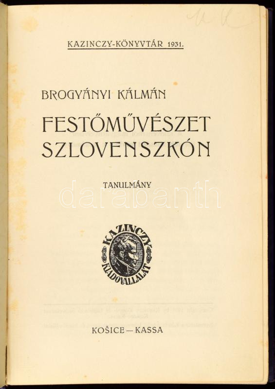 Brogyányi Kálmán: Festőművészet Szlovenszkón. Tanulmány. Kazinczy-Könyvtár. Košice-Kassa, 1931, Kazinczy, (Presov/Eperjes, Kósch Árpád-ny.), 126p.+41 t. Kiadói aranyozott egészvászon-kötés, kopott borítóval.