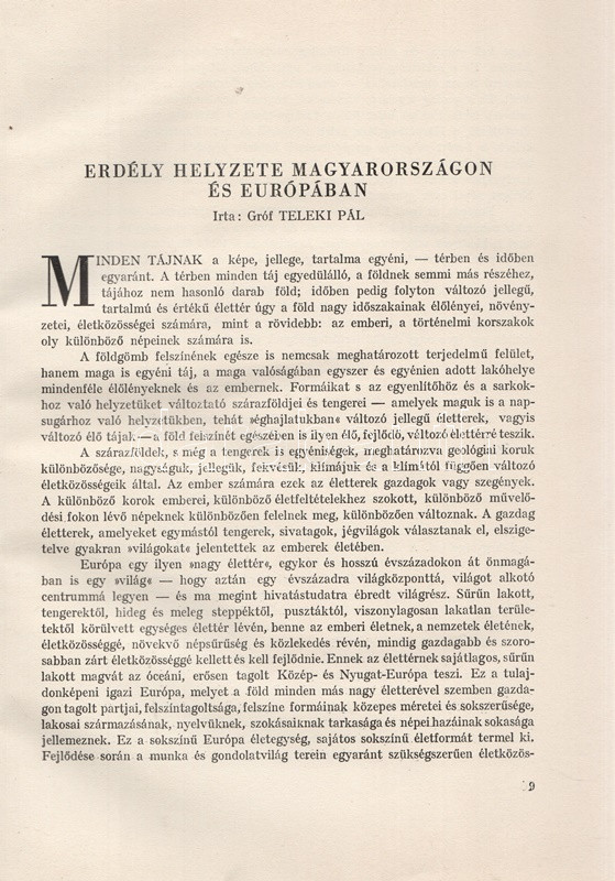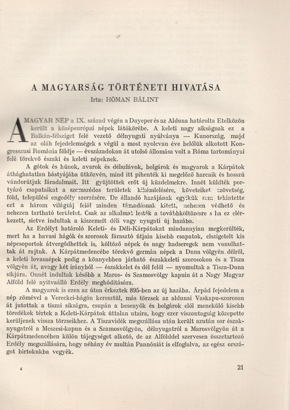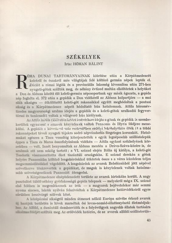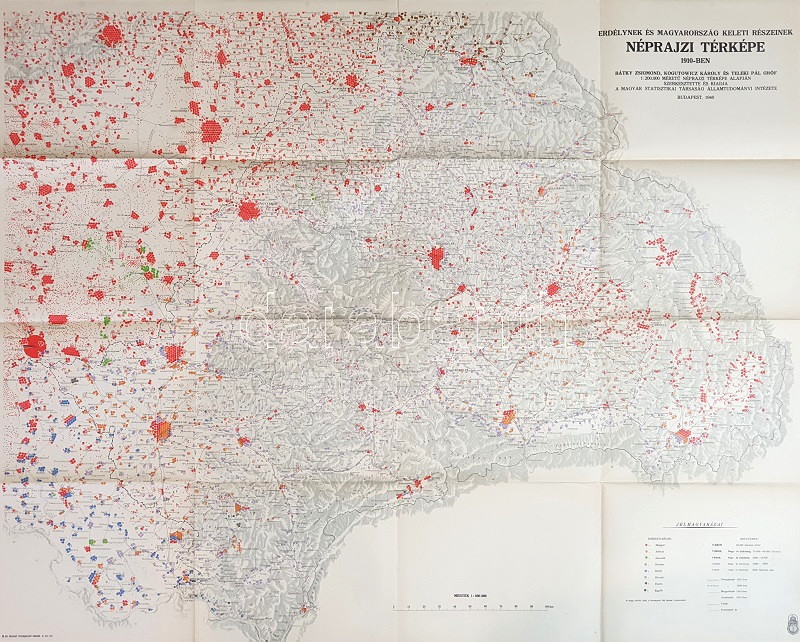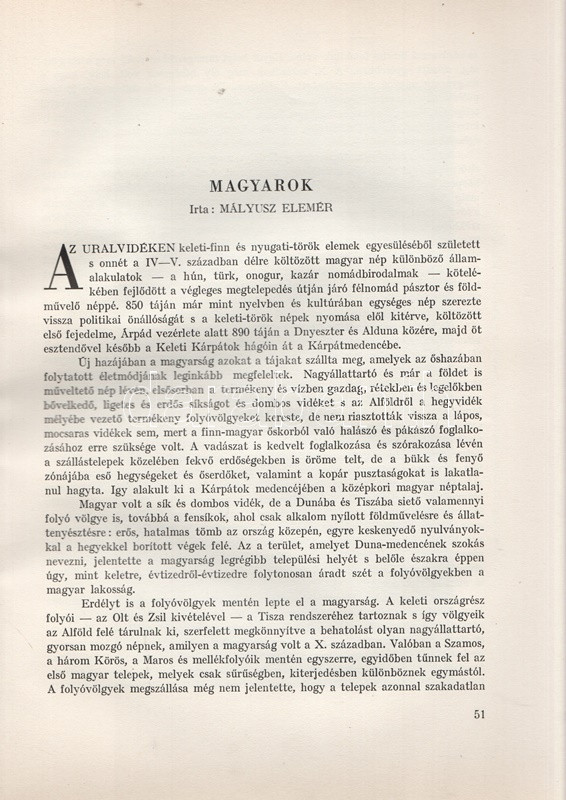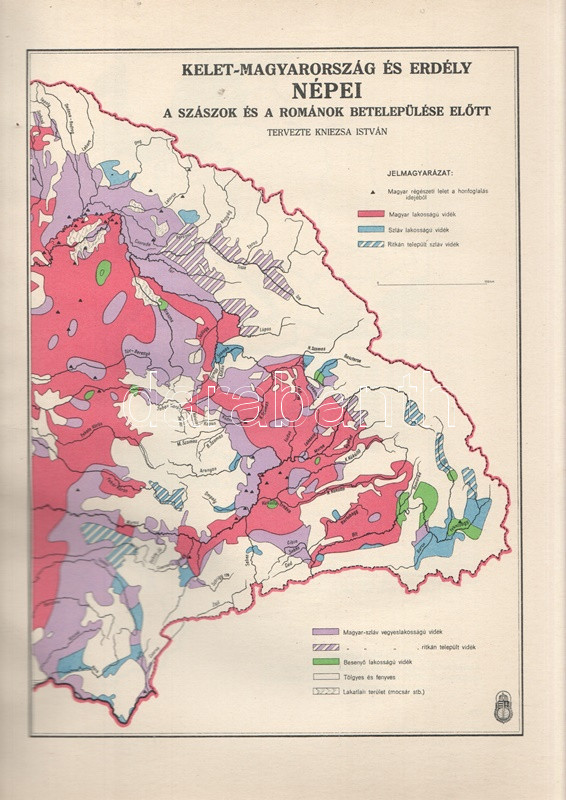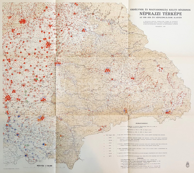 Erdély. Kiadja a Magyar Történelmi Társulat. Szerkesztő: Deér József. (Budapest), 1940. Athenaeum Irodalmi és Nyomdai Rt. - Magyar Királyi Honvéd Térképészeti Intézet. 263 + [1] p. + 138 t. (7 színes, 4 dupla oldalas) + 23 térkép (egy kihajtható; 17 színes, ebből 2 dupla oldalas, 2 kihajtható) + 4 melléklet (kihajtható néprajzi térképek, ebből 3 színes). Első kiadás. Az 1940. augusztus 1-jén megjelent, számos szerző által írt tanulmánygyűjtemény még az Észak-Erdélyt visszajuttató második bécsi döntés előtt látott napvilágot. Az előszó szerint a tudományosság számos területéről érkező szerzők elfogultság nélkül értékelik Erdély történelmi, gazdasági jelentőségét, és kimutatják, hogy az országrész minden szempontból szervesen tartozik az anyaországhoz. A kötet néprajzi tanulmányai a soknemzetiségű Erdély minden kultúráját a maga összetettségében mutatják be, ám a kötet egyes tanulmányaiból és rendkívül gazdag képanyagából az a tanulság világlik ki, hogy az Erdélybe lassan beköltöző románság - bár kultúrájának jelentős részét a magyar lakosságtól kölcsönözte - mégis egyedi, és sajátosan nyomorúságos kulturális nívón él. A tartalomból: Teleki Pál: Erdély helyzete Magyarországon és Európában - Hóman Bálint: A magyarság történeti hivatása - Alföldi András: Dákok és rómaiak - Hóman Bálint: Székelyek - Mályusz Elemér: Magyarok - Pukánszky Béla: Szászok - Tamás Lajos: Románok - Lukinich Imre: Erdély önálló állami élete - Deér József: A szászok jogállása - Tóth András: Az erdélyi románság jogállása - Elekes Lajos: A román államélet magyar gyökerei - Berlász Jenő: Erdély gazdasági élete - Viski Károly: Erdélyi népélet - Gerevich Tibor: Erdélyi magyar művészet - Fitz József: A könyv sorsa Erdélyben - Tamás Lajos: Az oláh műveltség magyar gyökerei - Római Andrásd: Uralomváltozás Erdélyben - Kovács Alajos: Erdély népesedési viszonyai - Rónai András: Erdély gazdasági élete Romániában. A kötet népmozgalmi térképei: Román települések Kelet-Magyarországib a XIII. és XIV. században - Erdélynek és Magyarország keleti részének néprajzi térképe 1910-ben - Erdélynek és Magyarország keleti részének néprajzi térképe az 1930-1939. évi népszámlások alapján - Románia települési térképe 1930. Aranyozott kiadói egészvászon kötésben. Jó példány.