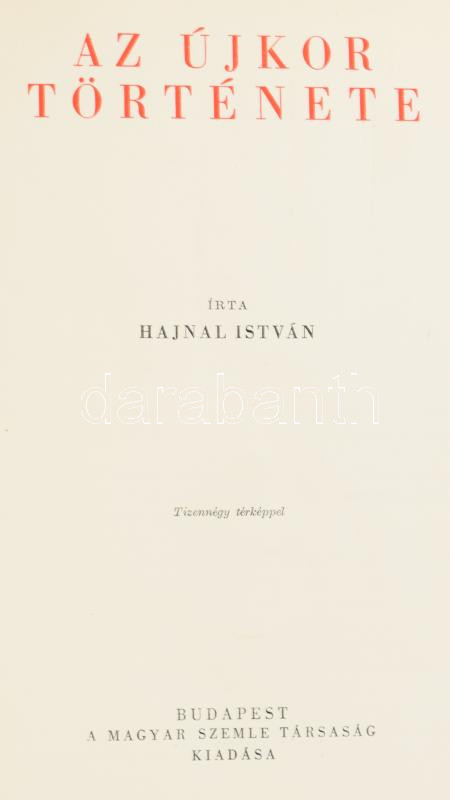 Hóman Bálint, Szekfű Gyula, Kerényi Károly (szerk.): Egyetemes történet. I-IV. kötet. 1. Az ókor története. Szerk. Kerényi Károly. 2. Váczy Péter: A középkor története. 3. Hajnal István: Az újkor története. 4. Iványi-Grünwald Béla: A legújabb kor története. Bp.,én., Magyar Szemle Társaság-Révai Testvérek Irodalmi Intézet Rt. Második kiadás. Kiadói aranyozott félbőr kötésben, kopott borítókkal és gerincekkel.